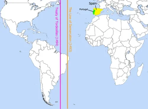 Define and place in a sentence: Line of demarcation, circumnavigate, Columbian Exchange.